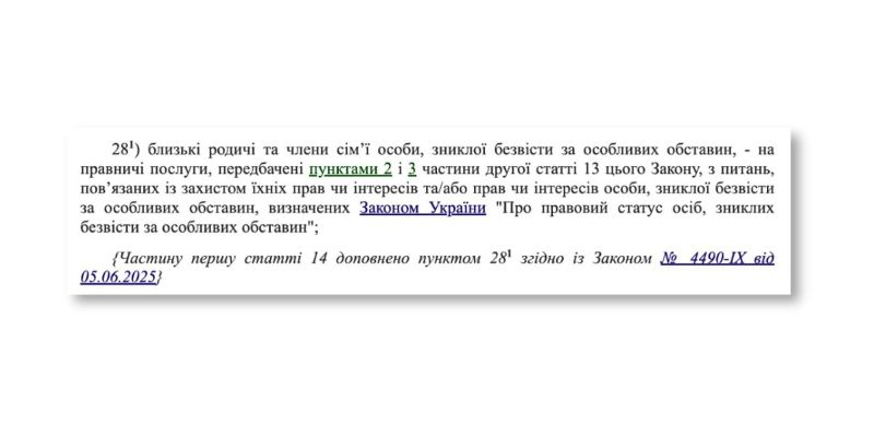 Близькі родичі та члени сім’ї осіб, зниклих безвісти за особливих обставин, тепер можуть отримати безоплатну вторинну правничу допомогу.