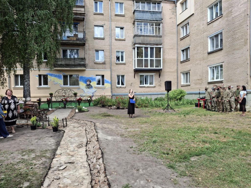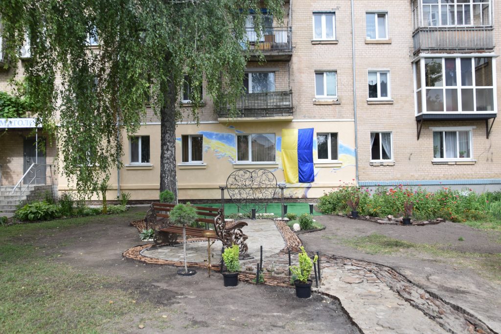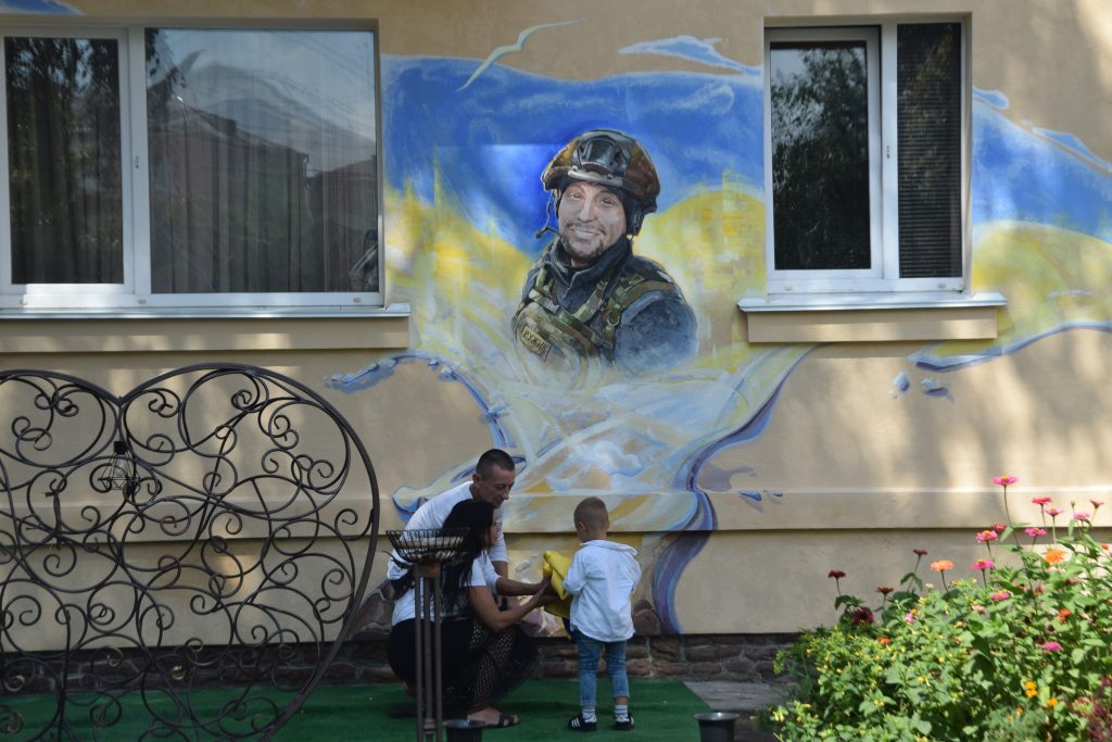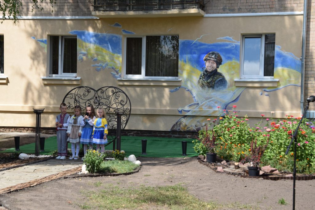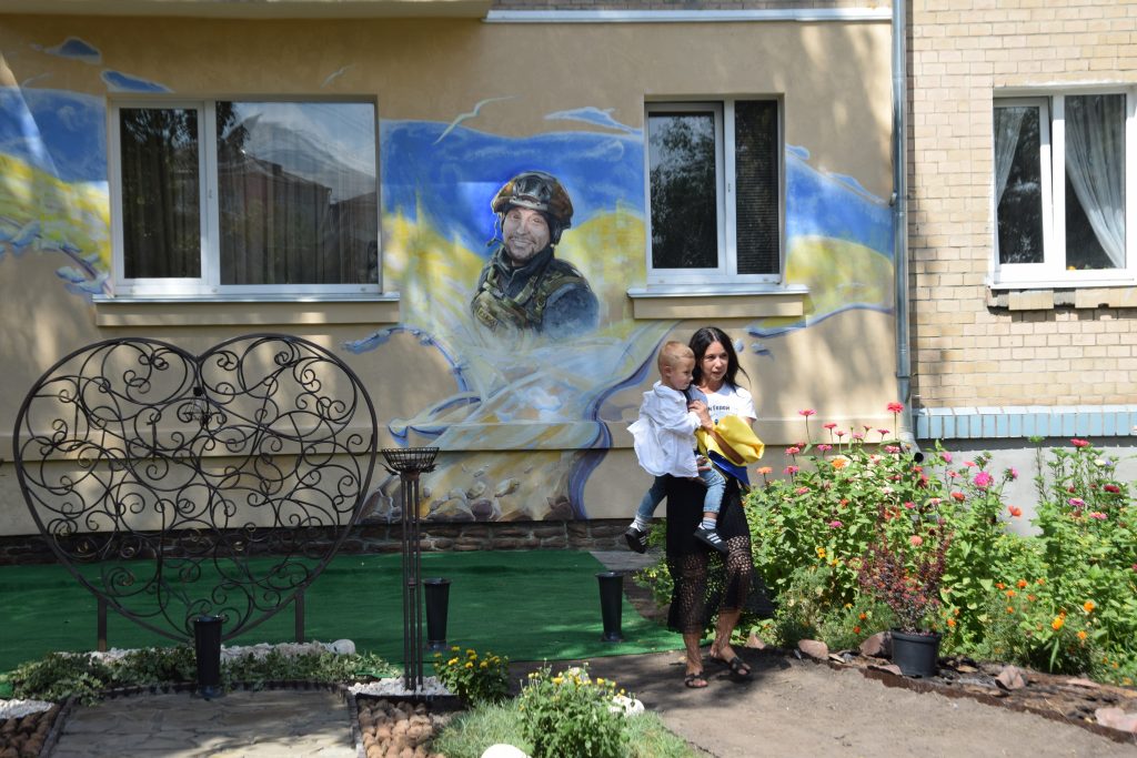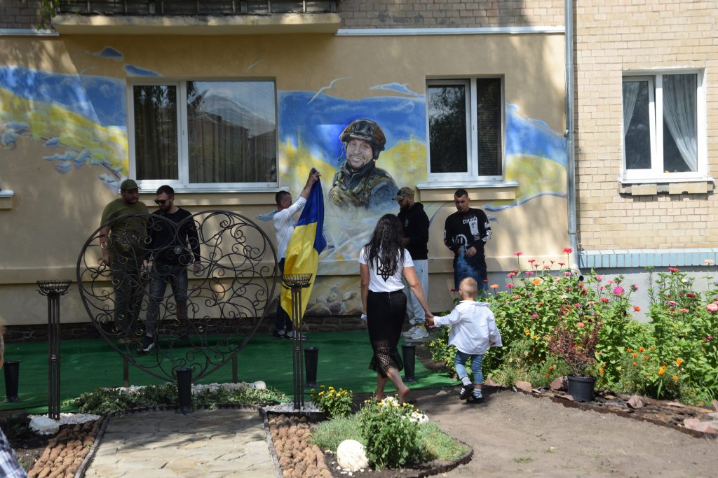 Подбала мама Дмитра й про благоустрій території навколо муралу – до самого стінопису веде викладена доріжка, неподалік нього лавка для спочинку, висаджені квіти, кущі та велике металеве серце – як символ невмирущості маминої любові до свого чада.