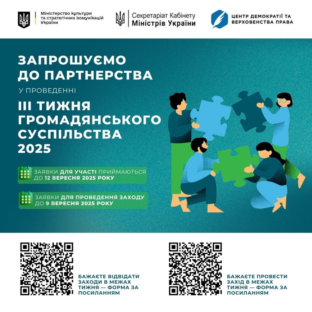 Відповідно до плану заходів з реалізації Національної стратегії сприяння розвитку громадянського суспільства в Україні на 2021–2026 роки, у період з 15 по 21 вересня 2025 року відбудеться Тиждень громадянського суспільства.