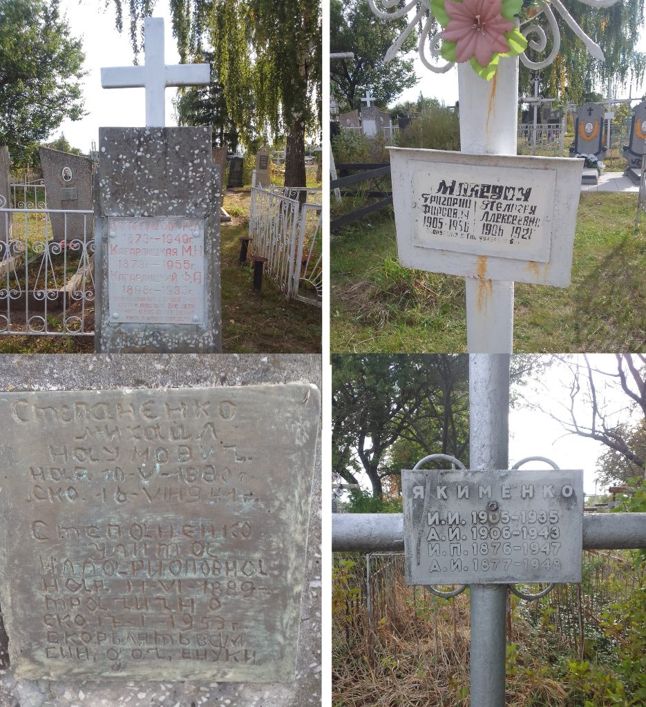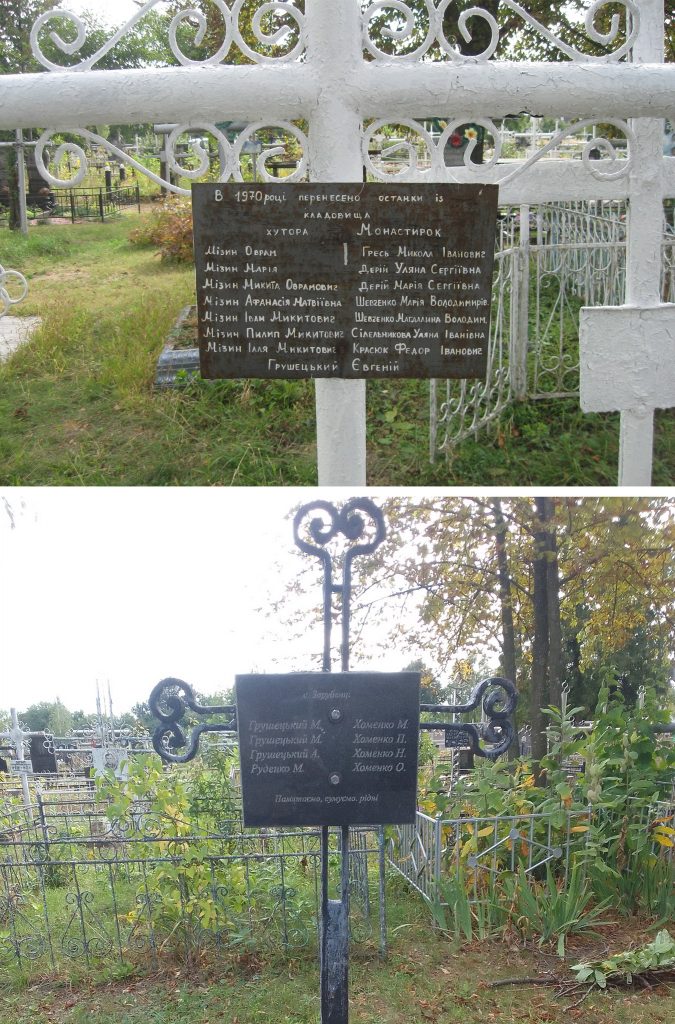 На перепохованих могилах встановлювалися хрести, переважно залізні. На захороненнях 1980–2000-х років частіше з’являються пам’ятники — з гранітного відсіву, граніту чи лабрадориту, у вигляді прямокутної або фігурної стели з епітафіями. Останнім часом тильну сторону таких пам’ятників стали прикрашати гравірованими малюнками. Відходить мода на металеві огорожі навколо могил — натомість прилеглу ділянку викладають плиткою з символічним гранітним обрамленням. Примітно, що деякі нащадки, впорядковуючи могили своїх предків, замінюють старі хрести й надгробки на сучасні пам’ятники.