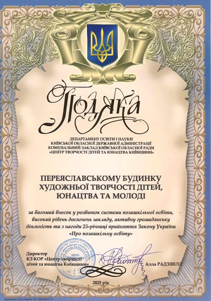 Переяславський будинок художньої творчості дітей, юнацтва та молоді, усвідомлюючи що цінність позашкільної освіти в умовах війни набуває нових життєдайних сенсів, продовжує надавати якісну позашкільну освіту дітям та молоді Переяславської громади, презентуючи свої кращі практики на рівні області та всієї України. Освітнє середовище Переяславського будинку художньої творчості дітей, юнацтва та молоді – це простір, в якому усі учасники освітнього процесу мають можливість зростати і розвиватися в умовах довіри, свободи, рівності та втілювати свої креативні ідеї, які змінюватимуть світ на краще. Діяльність колективу Переяславського будинку художньої творчості дітей, юнацтва та молоді відома в області його освітніми та методичними знахідками, цікавими освітніми проєктами та соціальними ініціативами, оригінальними творчими та науковими дитячими роботами та високими здобутками на конкурсах. За вагомий внесок у розвиток системи позашкільної освіти, високий рівень досягнень закладу, активну громадянську діяльність та з нагоди 25-річчя прийняття Закону України «Про позашкільну освіти» колектив Переяславського БХТДЮМ нагороджено Подякою Департаменту освіти і науки Київської обласної ради та Центру творчості дітей та юнацтва Київщини.