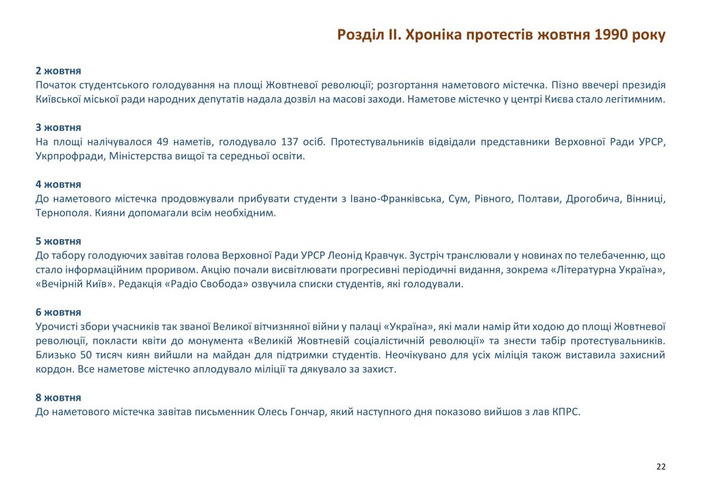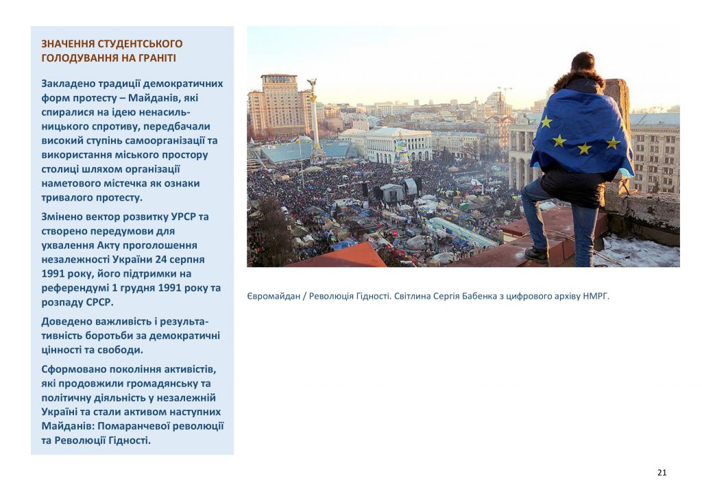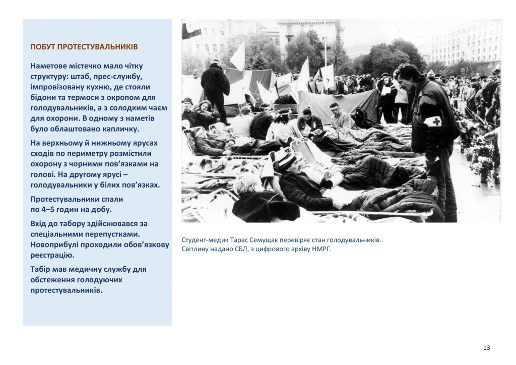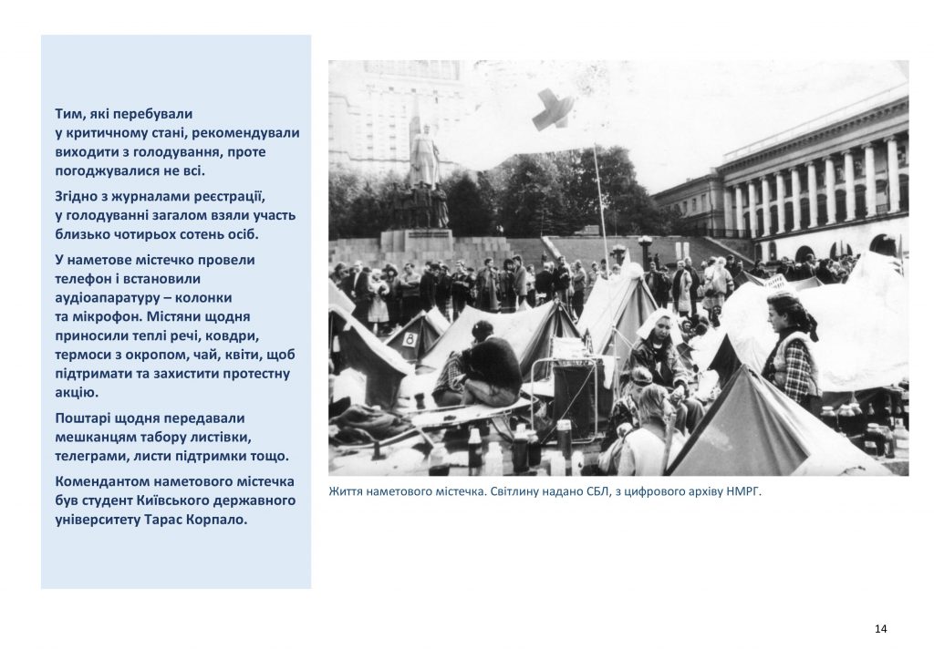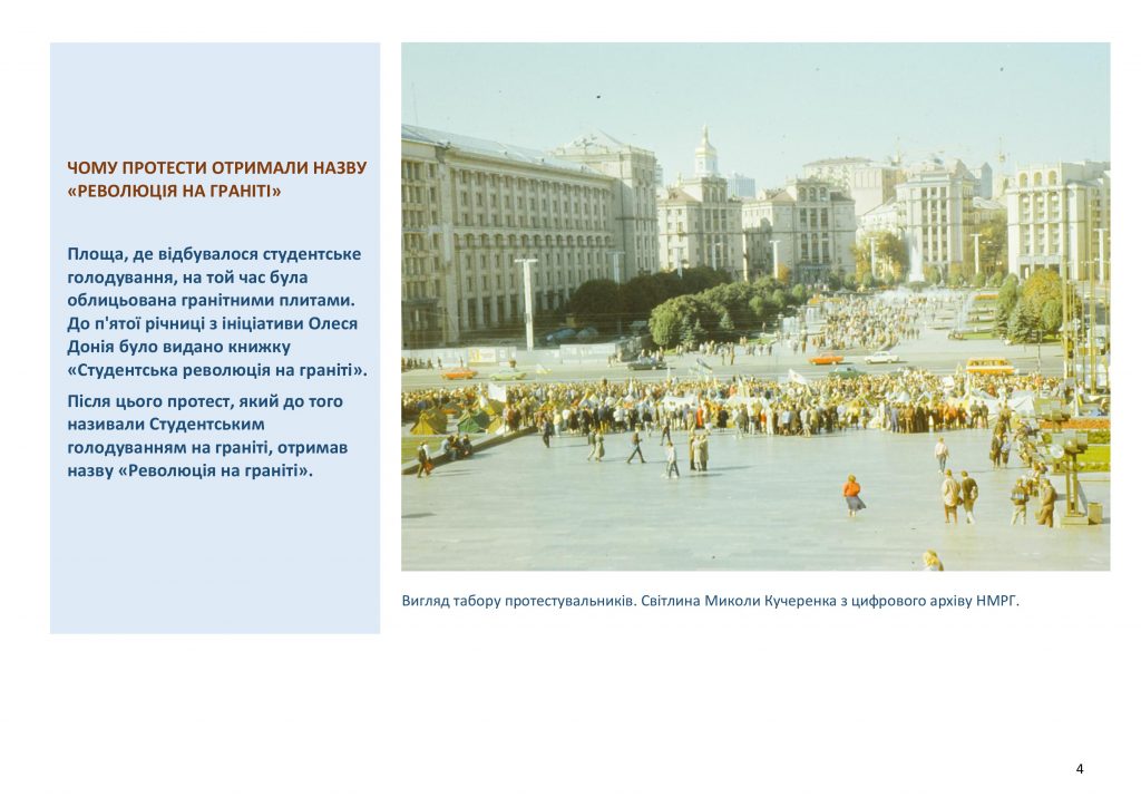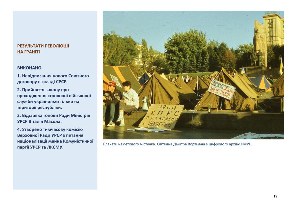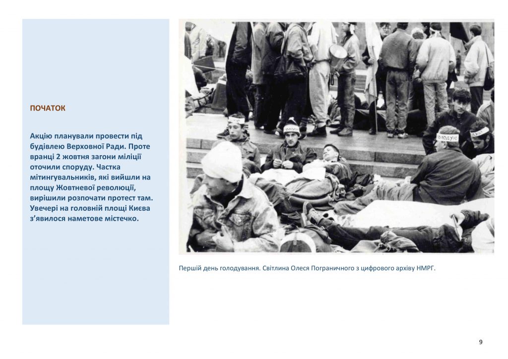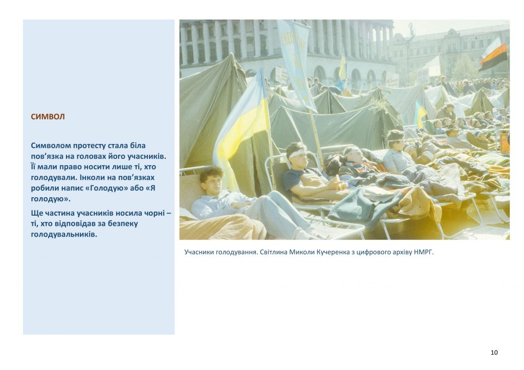 Голодування було визнано оптимальною формою протесту, яка давала можливість, на думку організаторів, домогтися поставлених цілей. Так почалися події, що увійшли в історію як Революція на граніті. Вони стали каталізатором змін, що посприяли відновленню української незалежності, боротьба за яку тривала впродовж ХХ століття: від проголошення УНР, діяльності ОУН й УПА, шістдесятників, дисидентів до українських Майданів, серед яких першим масовим протестом стали події жовтня 1990 року на гранітних плитах середмістя Києва.