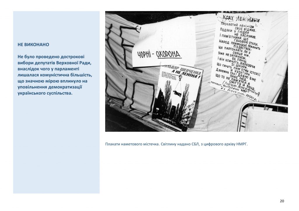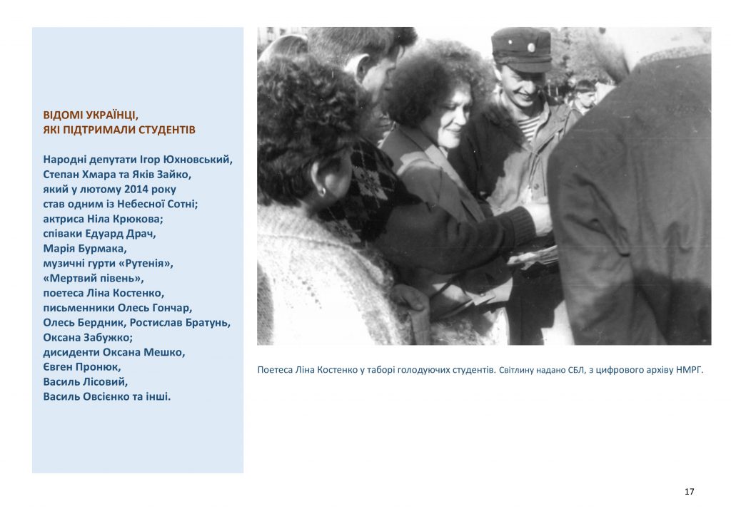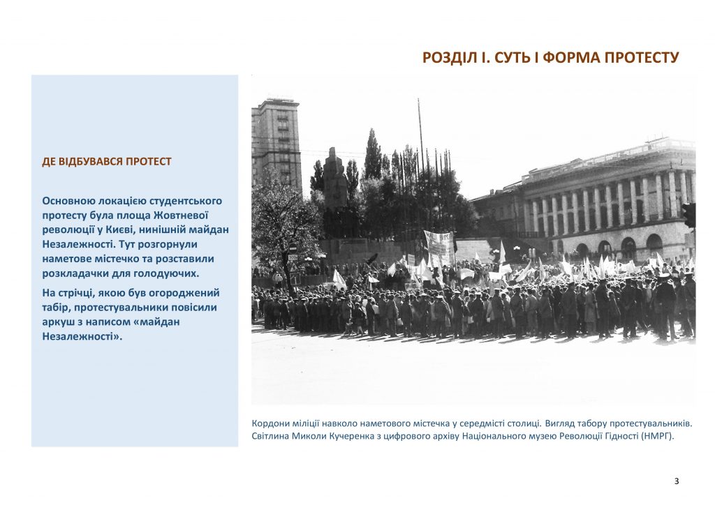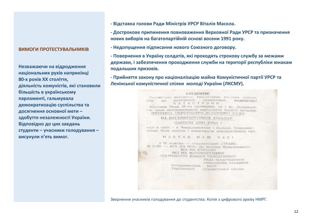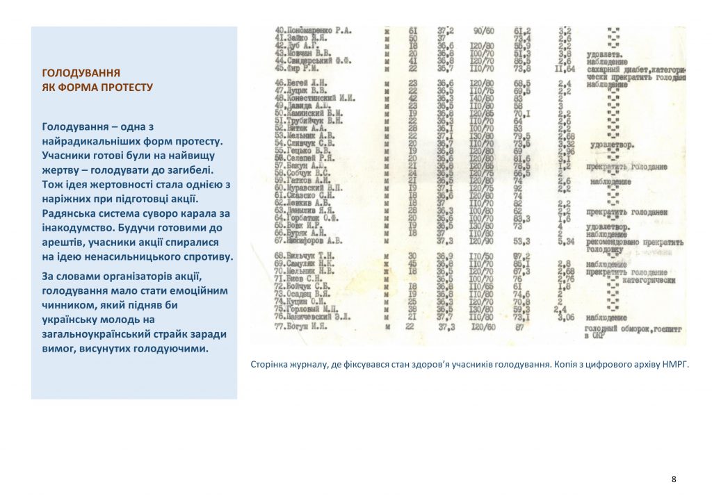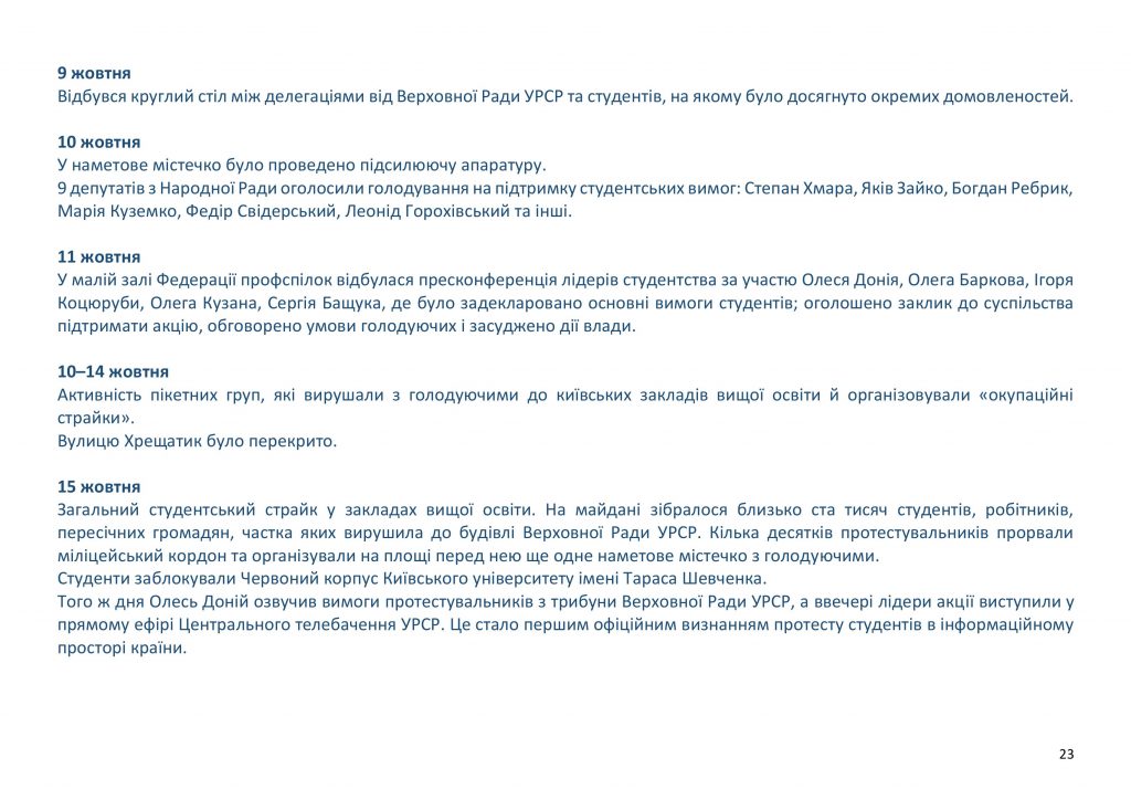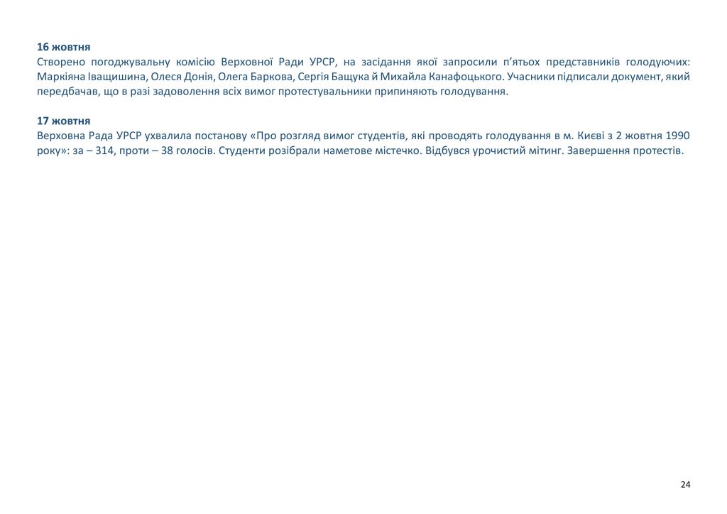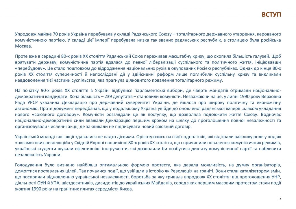 Голодування було визнано оптимальною формою протесту, яка давала можливість, на думку організаторів, домогтися поставлених цілей. Так почалися події, що увійшли в історію як Революція на граніті. Вони стали каталізатором змін, що посприяли відновленню української незалежності, боротьба за яку тривала впродовж ХХ століття: від проголошення УНР, діяльності ОУН й УПА, шістдесятників, дисидентів до українських Майданів, серед яких першим масовим протестом стали події жовтня 1990 року на гранітних плитах середмістя Києва.
