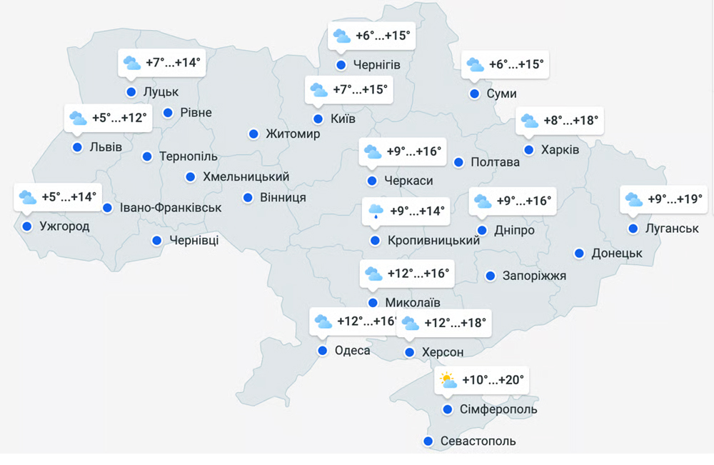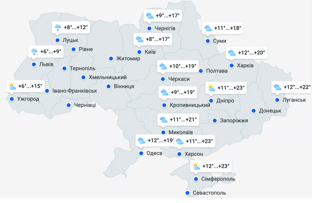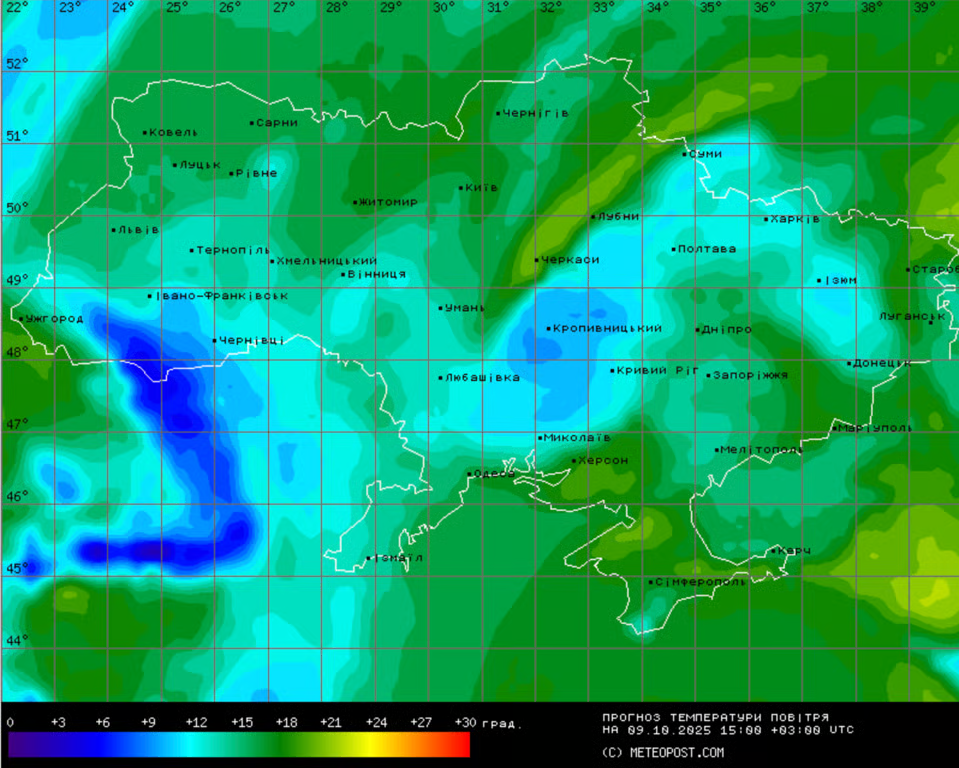 У четвер, 9 жовтня, під впливом циклону з Чорного моря більшість південних, центральних та східних областей очікуються дощі, місцями сильні, а на півдні можливі грози. Вітер здебільшого північний, 5-10 метрів на секунду, у південних регіонах та Криму місцями прогнозуються пориви 15-20 метрів на секунду. Температура повітря вночі +9…+14 °С, у західних областях +3…+8 °С. Вдень очікується +11…+17 °С.