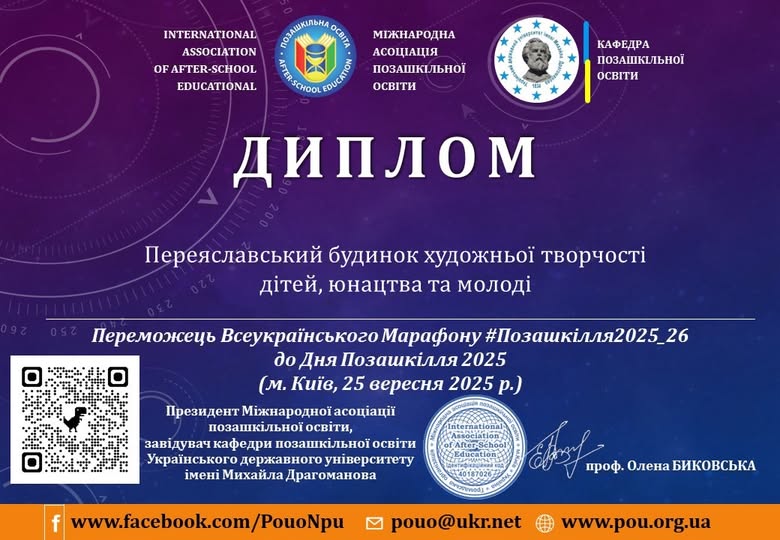Переяславський будинок художньої творчості дітей, юнацтва та молоді презентував свою багатогранну діяльність у Всеукраїнському марафоні «Позашкілля 2025-2026», зініційованому Міжнародною асоціацією позашкільної освіти (МАПО) і факультетом соціології та соціальної політики УДУ ім. Михайла Драгоманова. У поданих матеріалах висвітлювались напрацювання та успіхи освітнього середовища БХТДЮМ, інновації та традиції закладу. Завдяки ентузіазму та згуртованості команди працівників та наполегливій результативній роботі усіх учасників освітнього процесу Переяславський будинок художньої творчості дітей, юнацтва та молоді нагороджено Дипломом переможця Всеукраїнського марафону «Позашкілля 2025-2026». Це ще один стимул продовжувати розбудову власного іміджу та дбати про створення якісного конкурентоспроможного освітнього середовища для розвитку дітей, юнацтва та молоді.
