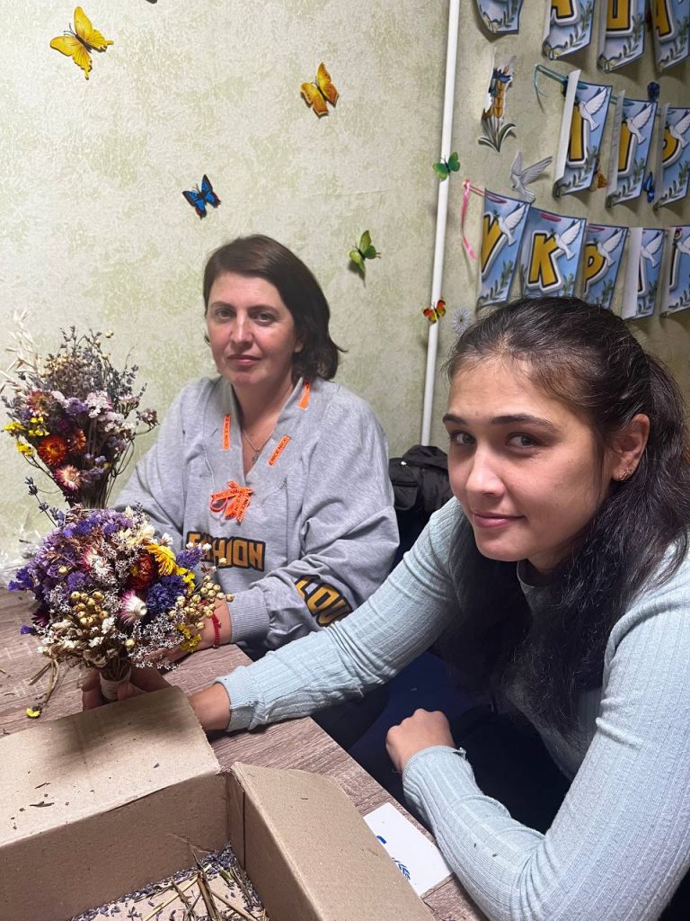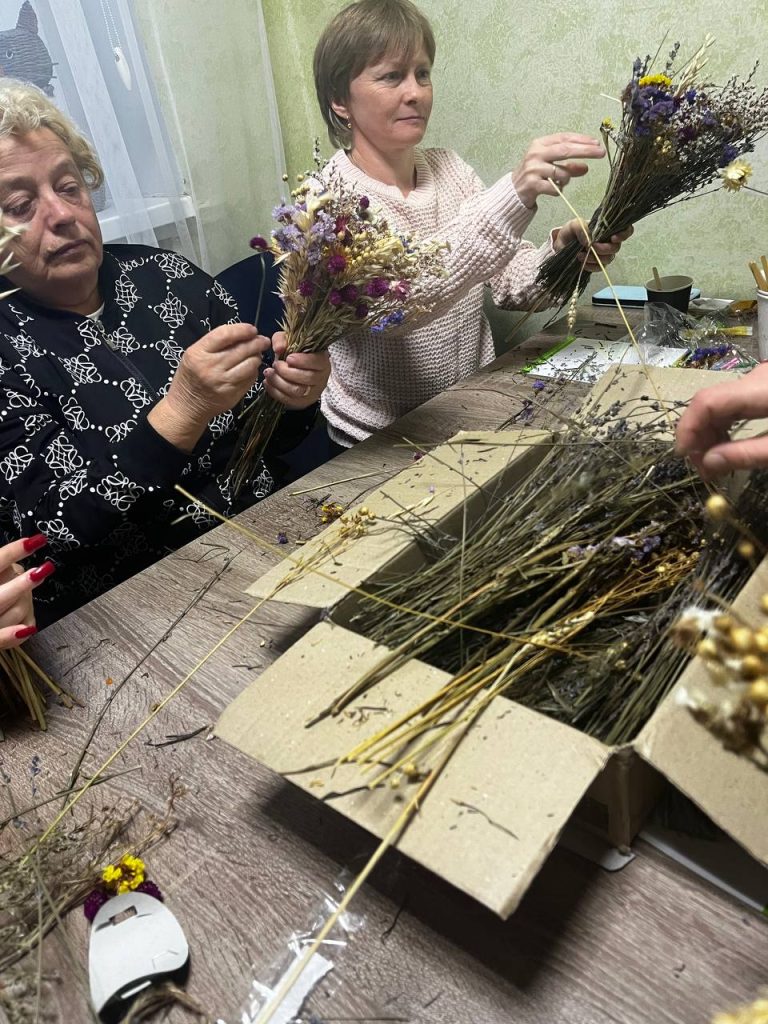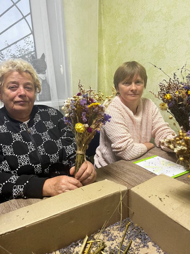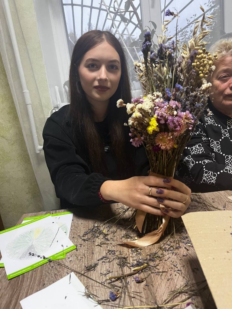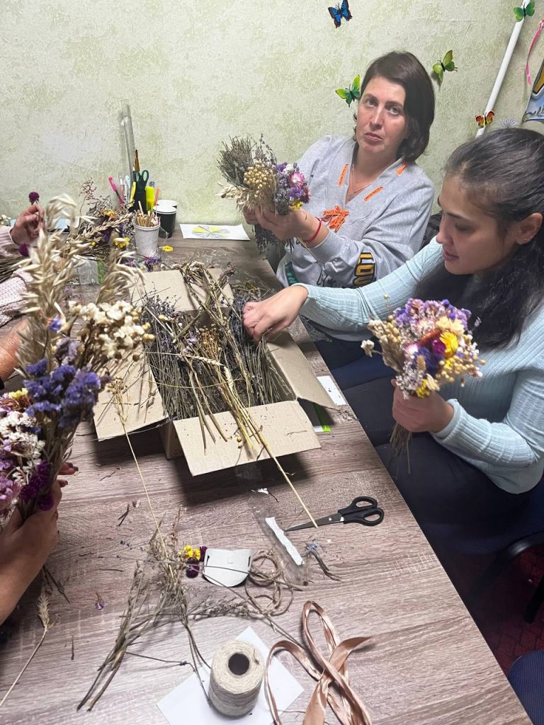 Творча частина зустрічі — створення букетів із сухоцвітів — допомогла закріпити нові відчуття. Кожна квітка символізувала ресурс: лаванда — спокій, жовта сухоцвітка — радість, колосок — стабільність. Додаючи до свого букета маленьку бджілку, яку обрали на початку заняття, учасниці ніби об’єднували свій початковий стан із новим — більш гармонійним, теплим і наповненим.
