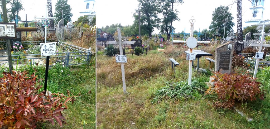 У 1839 році над хрестом було зведено цегляну церкву, а поруч, зі східного боку, селяни Кодратьєва (Кондратьєва) почали ховати своїх померлих. Цікавий факт: у метричних книгах Дем’янецької Хрестовоздвиженської церкви та ревізьких казках прізвище власника записано як Кодратьєв, тоді як у метричних книгах переяславських церков — як Кондратьєв. Як би там не було, на цьому кладовищі ховали не лише селян, а й самі Кодратьєви (Кондратьєви) спорудили родинний склеп, у якому були поховані Василь, Костянтин, Олімпіада Костянтинівна Слюсареська (Кондратьєва), Марія Василівна та інші члени родини.