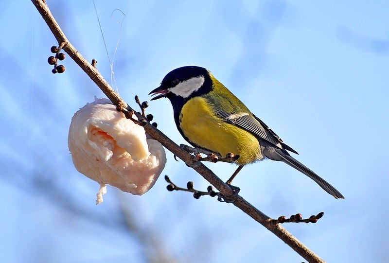 У синиць досить широкий діапазон раціону – вони можуть їсти і комах, і різноманітне насіння, зерно, тобто фактично споживають те, що вдається знайти.