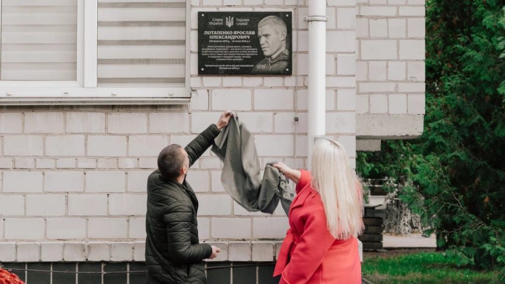 Після цього Віталій Коцур та дружина Ярослава Руслана Потапенко відкрили на фасаді університету меморіальну дошку із зображенням портрета Ярослава Потапенка з часів Майдану. На ньому викарбували його цитату: “Хтось втомився, розчарувався, зламався, виснажився, “перегорів” – але багато хто знаходить в собі сили рухатися далі, досягати успіхів, рятувати країну. Честь і хвала цим людям! Мусимо перемогти й подарувати нащадкам кращу, чеснішу, справедливішу державу”.