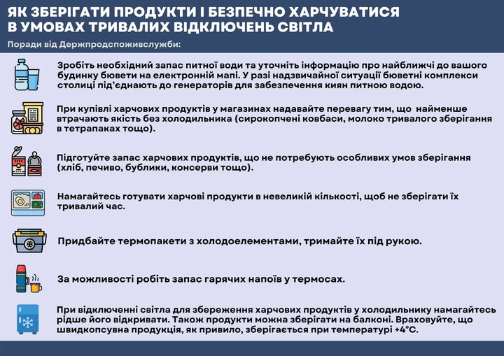 Якщо вже електроенергію відключили, тримайте дверцята холодильника та морозильної камери закритими, адже в такому випадку продукти залишаються безпечними до 4 годин у холодильнику, 48 годин у повній морозилці, 24 годин у напівпорожній морозилці. Якщо електроенергія відключена більше ніж 4 години, помістіть лід до продуктів у холодильну камеру.