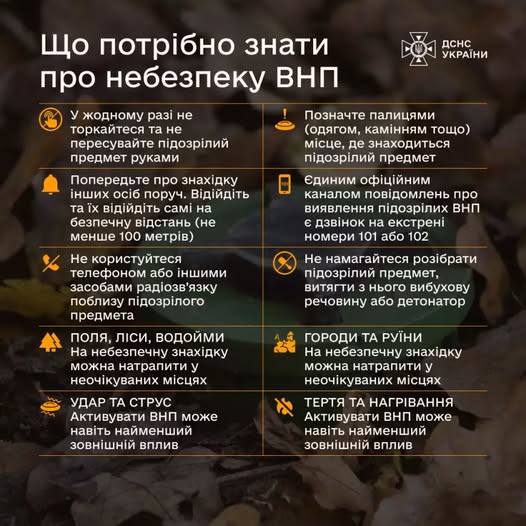 Виявивши вибухонебезпечні предмети негайно повідомте про це територіальні органи ДСНС та МВС за телефоном “101” та “102”.