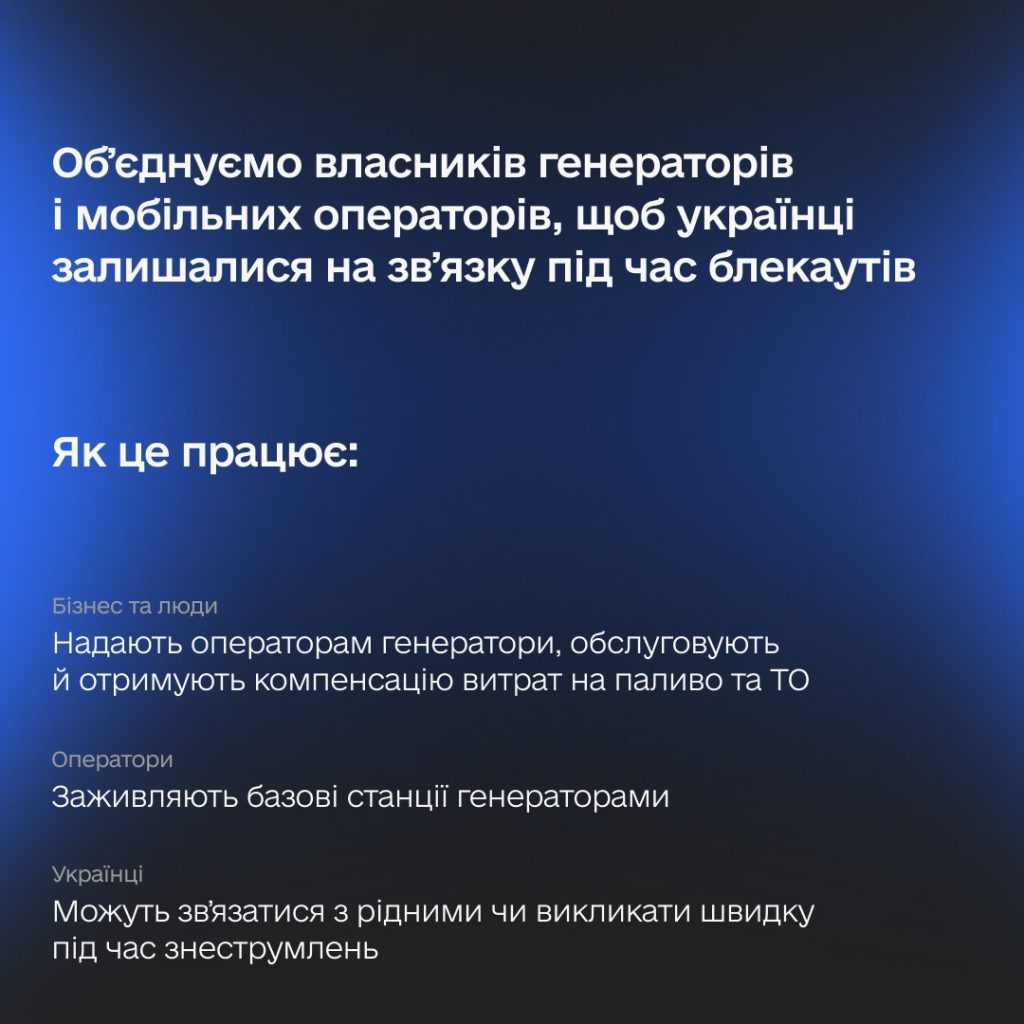 Генератор зв’язку — це соціальний проєкт, а не бізнес. Головна мета — не заробити, а підтримати збереження зв’язку під час блекаутів. Ви не здаєте свій генератор в оренду, а заправляєте та обслуговуєте його. Натомість мобільні оператори відшкодують вам витрати на пальне та необхідне технічне обслуговування генератора.