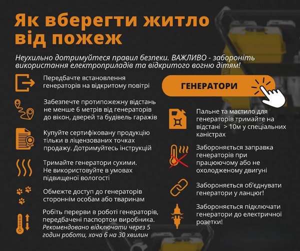 У зв’язку з перебоями електропостачання та наближенням холодів дедалі більше домогосподарств готуються до відключень, використовуючи резервні джерела енергії та автономні засоби обігріву, однак неправильне їх застосування, зокрема генераторів або пічного опалення, може призвести до аварій, пожеж і, на жаль, трагічних наслідків.