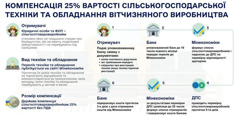 Відповідно до Постанови КМУ від 01.03.2017 № 130 в державному бюджеті передбачена часткова компенсація вартості сільськогосподарської техніки та обладнання вітчизняного виробництва. Часткова компенсація надається сільськогосподарським товаровиробникам на безповоротній основі за придбані техніку та обладнання, вартість яких зазначена в актах приймання-передачі та інших документах, що підтверджують оплату через уповноважений банк, у розмірі 25 відсотків вартості (без урахування ПДВ).