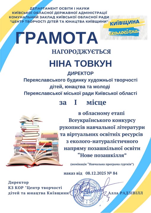 У Центрі творчості дітей та юнацтва Київщини закінчився обласний етап Всеукраїнського конкурсу рукописів навчальної літератури та віртуальних освітніх ресурсів з еколого-натуралістичного напряму позашкільної освіти «Нове позашкілля». Ніна ІванівнаТовкун, директор Переяславського будинку художньої творчості дітей, юнацтва та молоді представляла найкращі педагогічні підходи до екологічної освіти, апробовані в роботі з гуртківцями БХТДЮМ. Згідно рішення журі «Навчальна програма з позашкільної освіти «Екошлях (Ecopath): від відкриттів до дій» зайняла І місце. Як зазначили у висновках члени журі, ця програма є цілісною, сучасною, методично обґрунтованою та інноваційною. І саме це характеризує діяльність Ніни Іванівни як директора-адміністратора та креативного педагога. Адже завдяки її ініціативам та підтримці інноваційних ідей колективу ми разом впроваджуємо принципи екологізації освітнього процесу Переяславського БХТДЮМ та виховуємо покоління, що розуміє принципи сталого споживання і відповідально ставиться до довкілля. Програма, Ніни Товкун «Екошлях (Ecopath): від відкриттів до дій» представлятиме Київщину на Всеукраїнському конкурсі «Нове позашкілля».