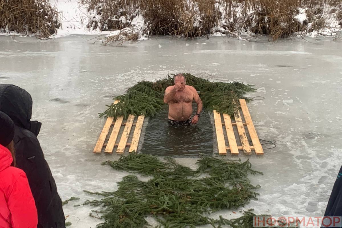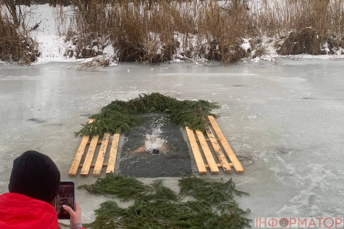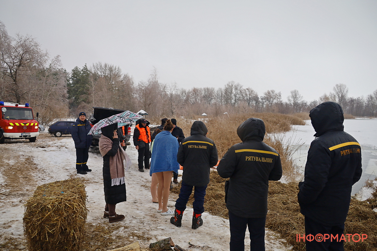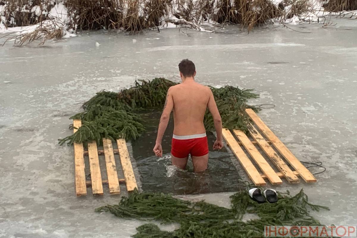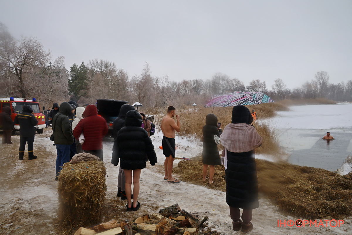 На місці купання на Дніпрі вирізали великий хрест із льоду, підхід до ополонки встелили соломою, а поруч розпалили багаття, де можна було зігрітися. Офіційної частини та освячення води тут не проводили, однак уже після 12:00 на пляжі почали збиратися люди. За годину їх було вже близько пів сотні.