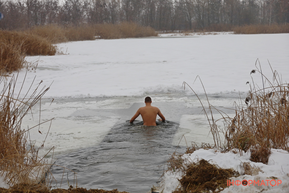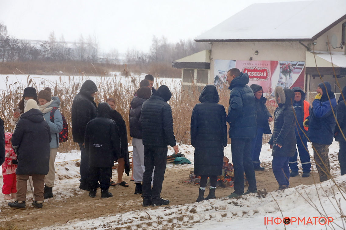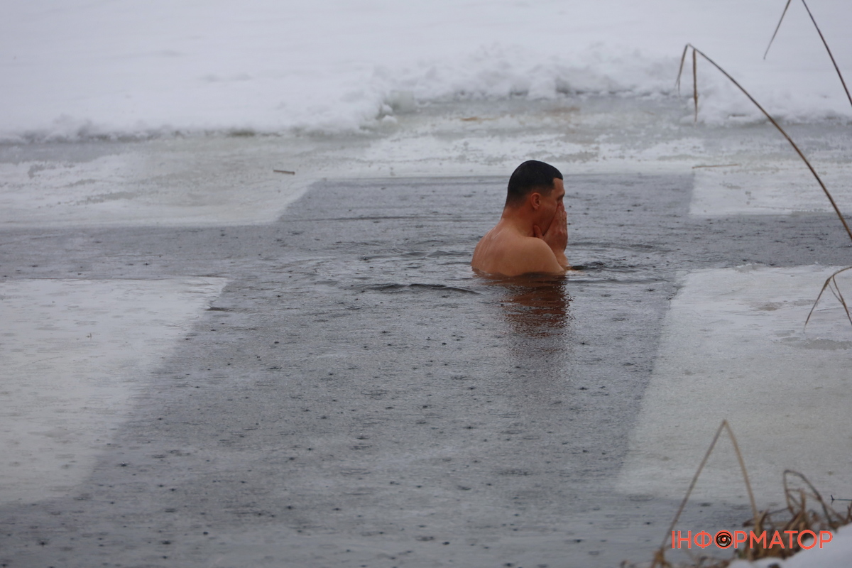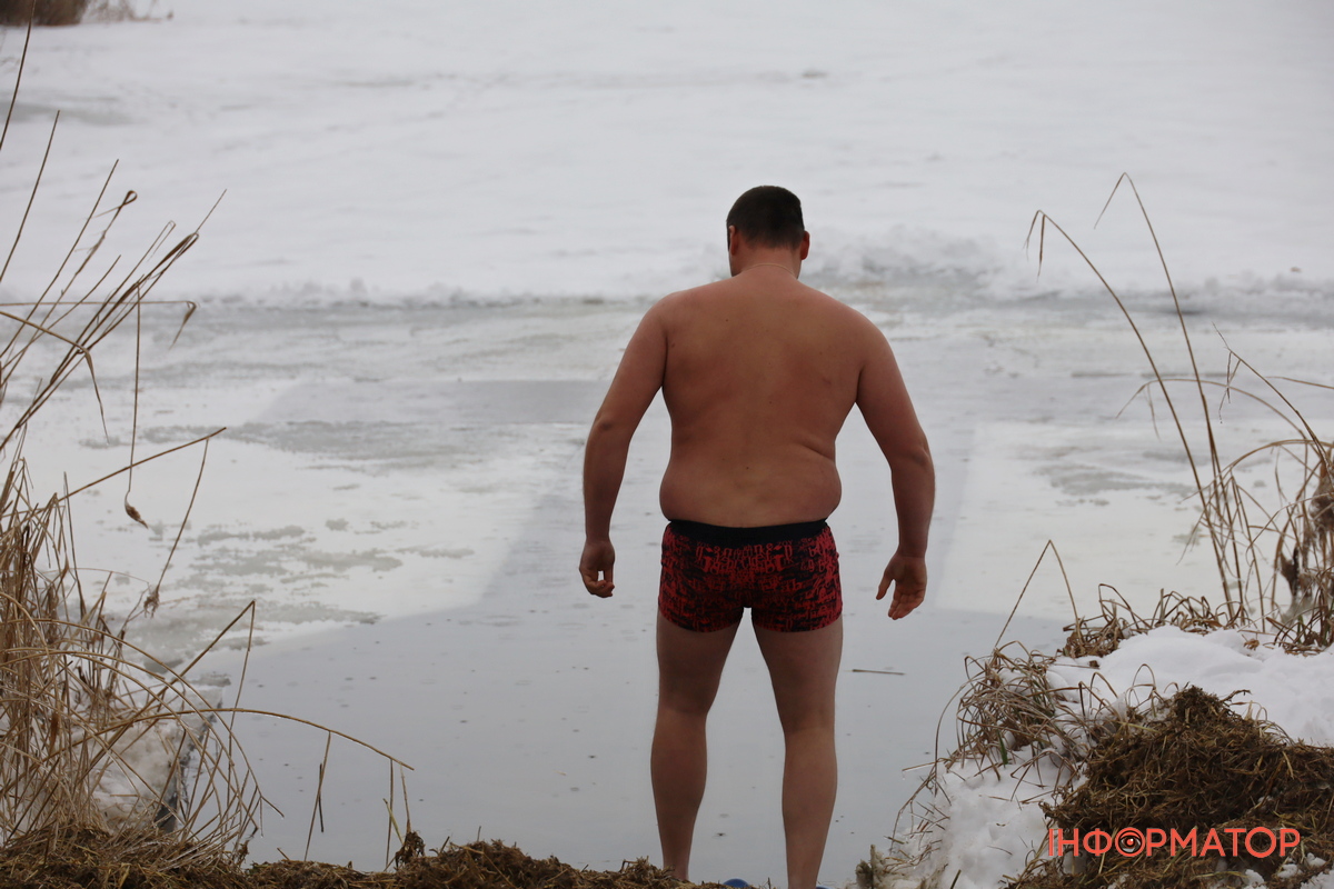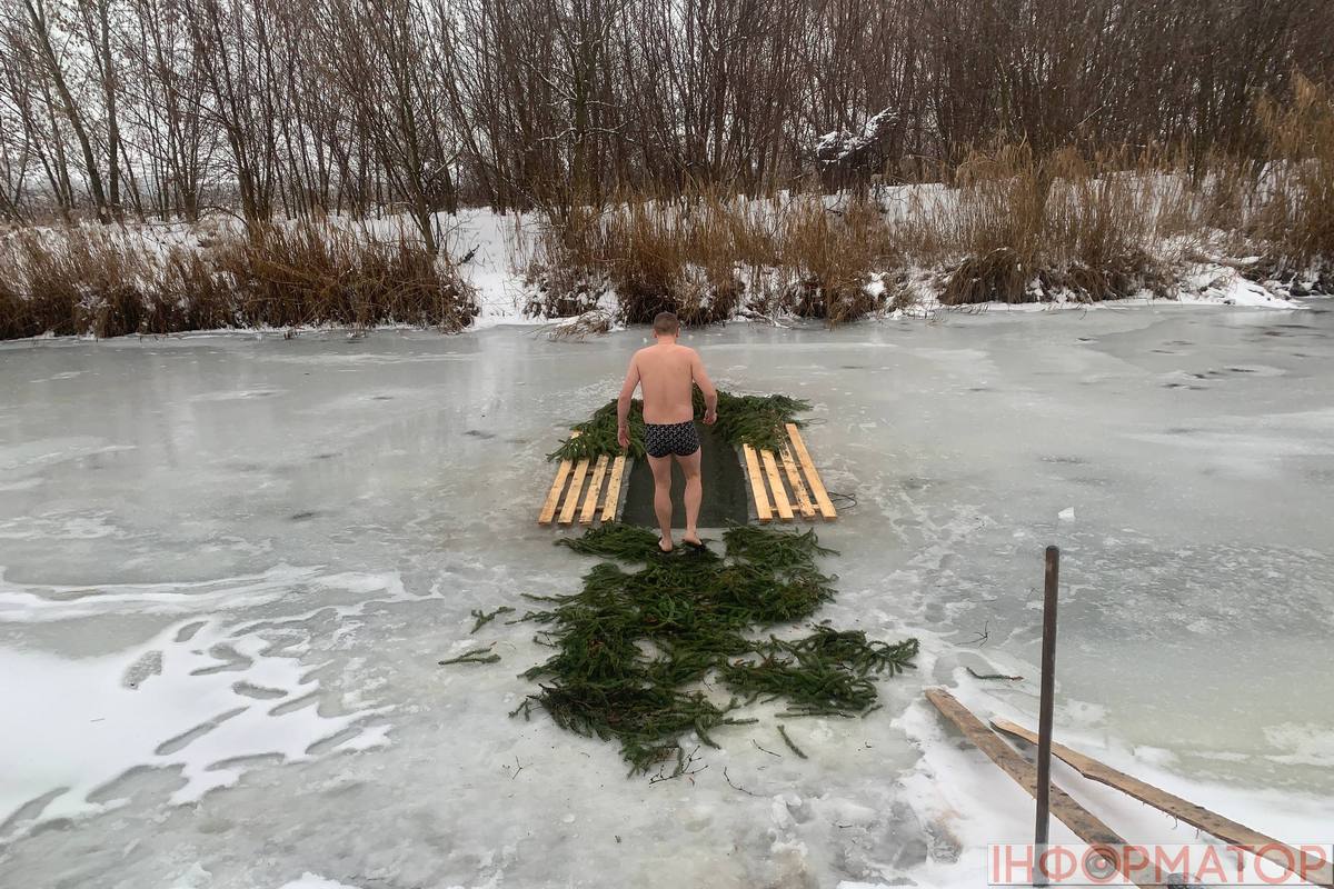 На місці купання на Дніпрі вирізали великий хрест із льоду, підхід до ополонки встелили соломою, а поруч розпалили багаття, де можна було зігрітися. Офіційної частини та освячення води тут не проводили, однак уже після 12:00 на пляжі почали збиратися люди. За годину їх було вже близько пів сотні.
