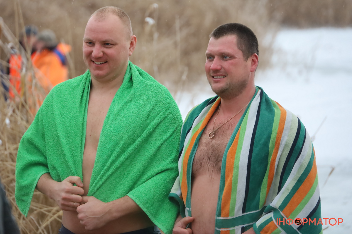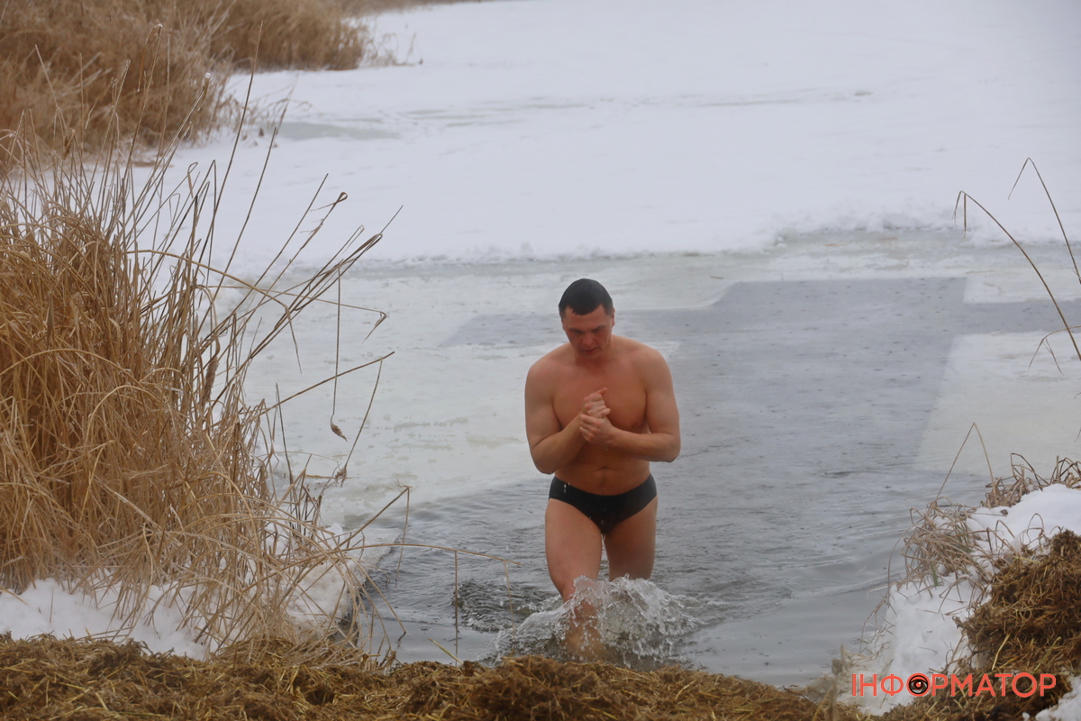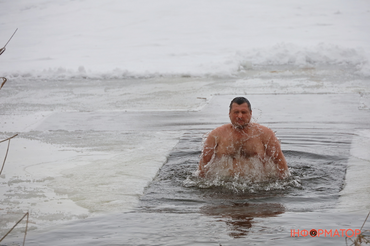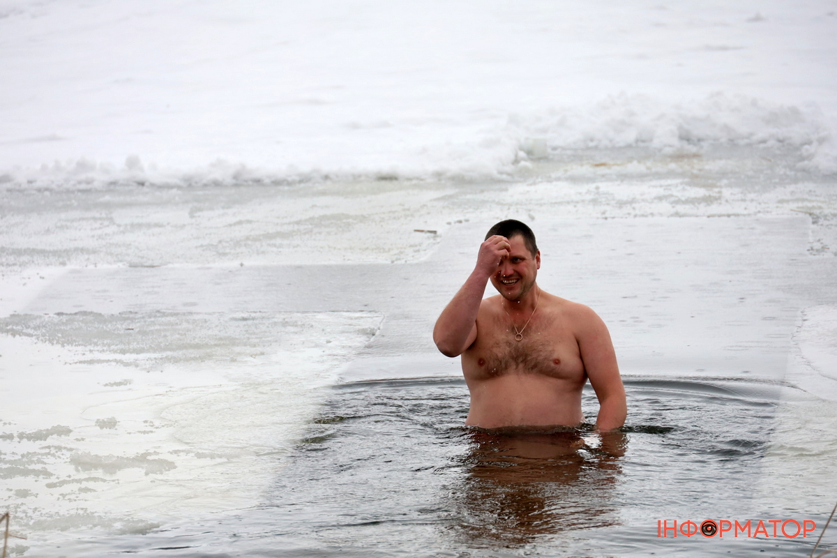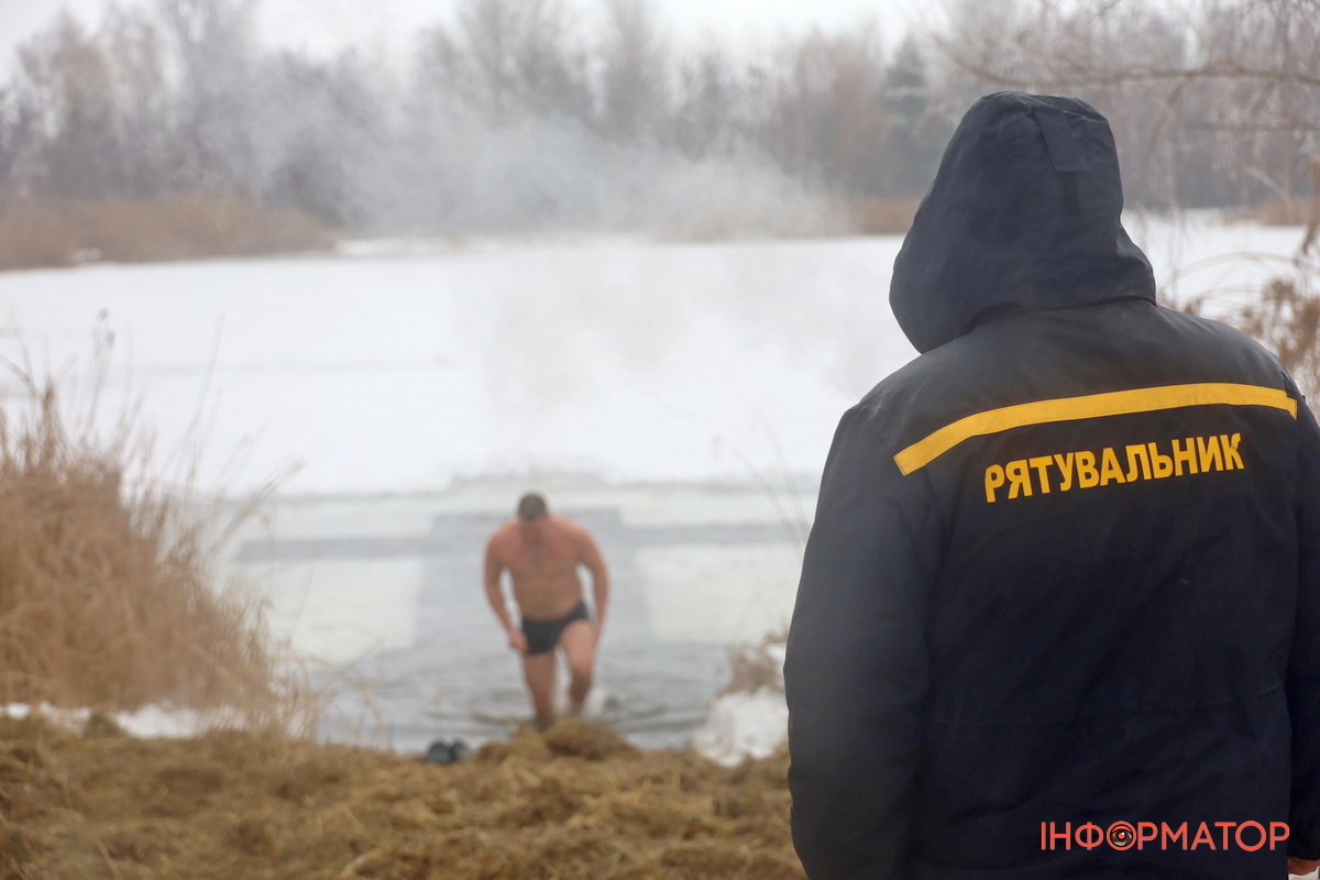 На місці купання на Дніпрі вирізали великий хрест із льоду, підхід до ополонки встелили соломою, а поруч розпалили багаття, де можна було зігрітися. Офіційної частини та освячення води тут не проводили, однак уже після 12:00 на пляжі почали збиратися люди. За годину їх було вже близько пів сотні.