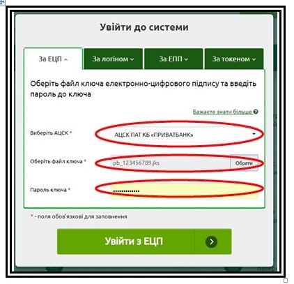 - Натиснути «Вхід», обрати «За ЕЦП» вибрати потрібний «АЦСК», завантажити ключ та ввести свій пароль до нього;