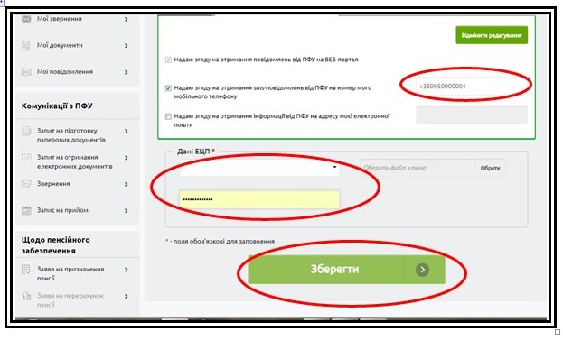 - Поставитит позначку «Надаю згоду на отримання смс-повідомлень від ПФУ на номер мого мобільного телефону»;