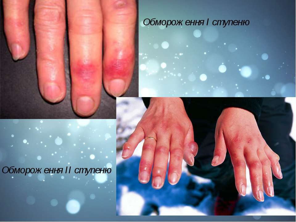 Уражена шкіра — бліда, після зігрівання набрякає, червоніє або багряніє. Таке ушкодження зазвичай повністю відновлюється через декілька днів без наслідків.