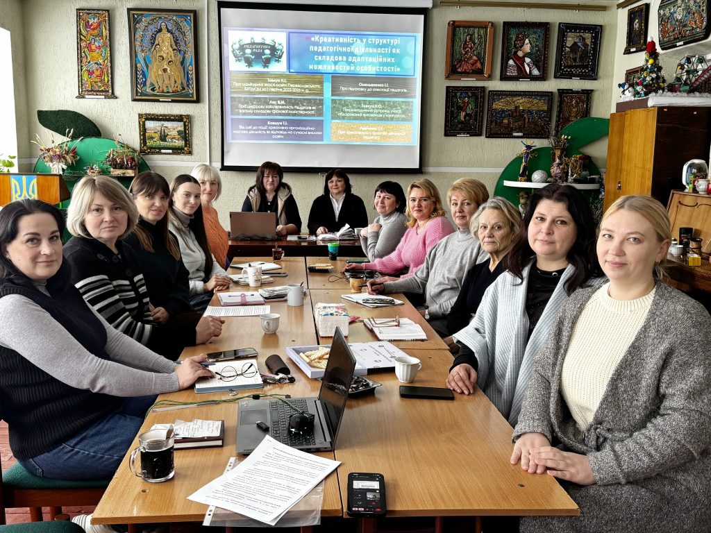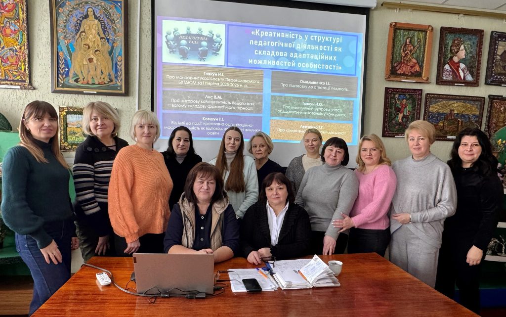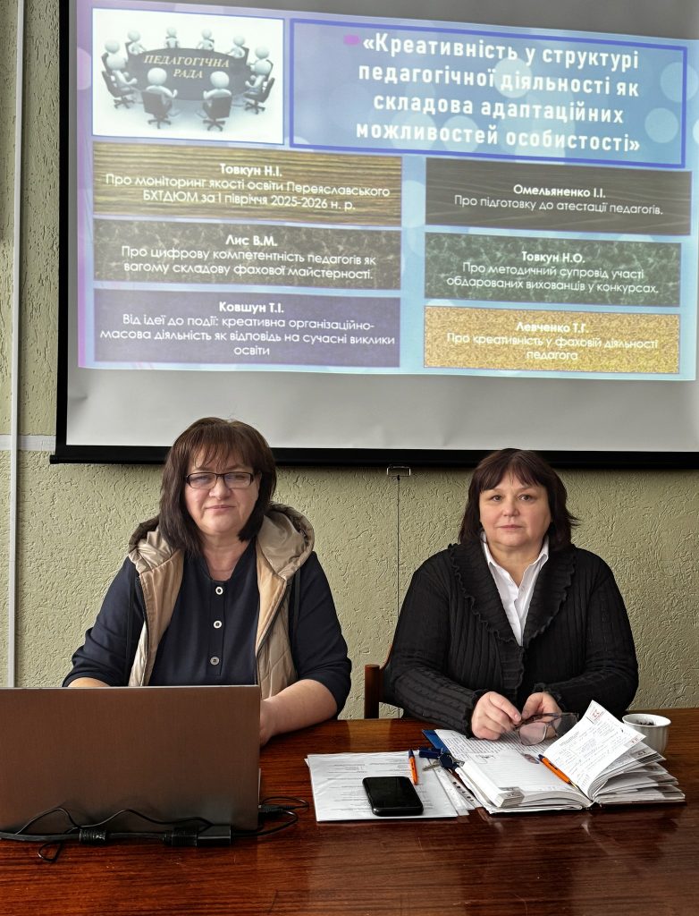 У Переяславському будинку художньої творчості дітей, юнацтва та молоді відбулося засідання педагогічної ради з елементами тренінгу «Креативність у структурі педагогічної діяльності як складова адаптаційних можливостей особистості». Директор закладу Ніна Іванівна Товкун презентувала колегам результати моніторингу якості освіти Переяславського БХТДЮМ за І півріччя 2025-2026 н. р. Ірина Омельяненко, заступник директора, повідомила про хід атестації педагогів БХТДЮМ. Про методичний супровід участі обдарованих вихованців у конкурсах керівники гуртків обговорювали разом із методистом БХТДЮМ Ніною Олександрівною Товкун. Тетяна Ковшун, завідуюча відділом організаційно-масової роботи, стала модератором обговорення питання про креативність у фаховій діяльності педагога закладу позашкільної освіти. Щоденна спільна креативна діяльність педагогів Переяславського БХТДЮМ сприяє удосконаленню освітнього простору закладу, робить його ефективнішим, цікавішим та пізнавальним.
