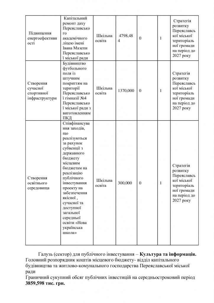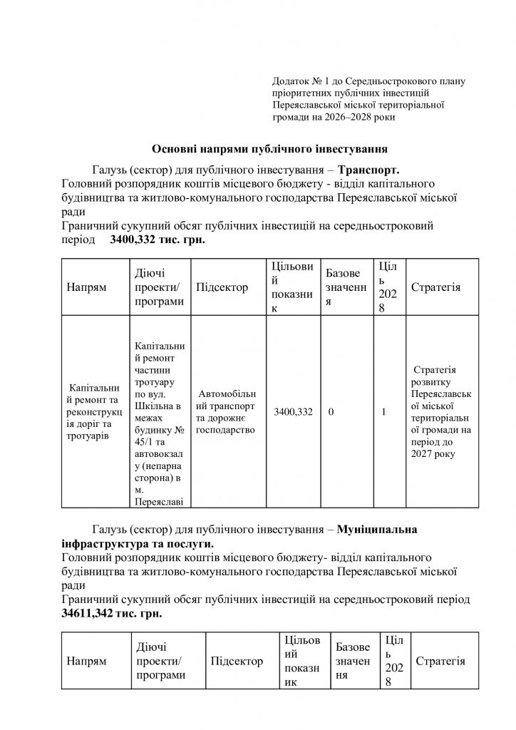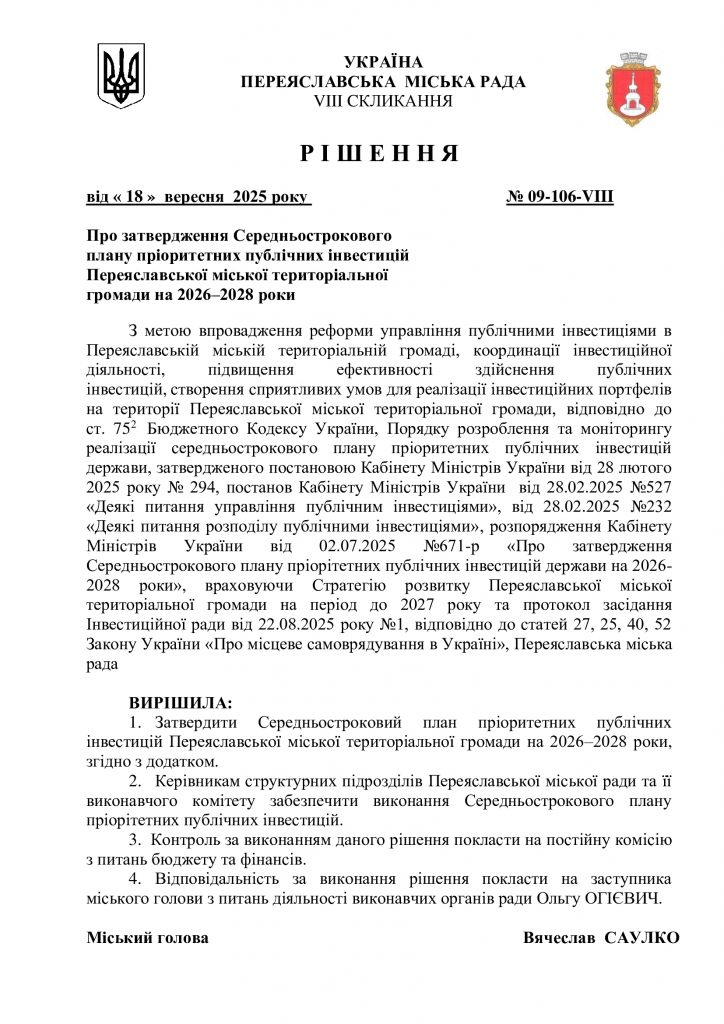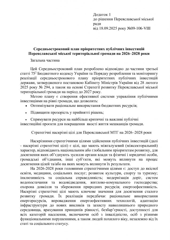 Рішення міської ради “Про затвердження Середньострокового плану пріоритетних публічних інвестицій Переяславської міської територіальної громади на 2026-2028 роки” 23.09.2025 by Адмін in Без категорії · 0 Коментарів