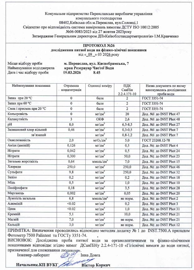 По санітарно-епідеміологічним показникам проби питної води відповідають ДСанПіНу 22.4-171-10 «Гігієнічні вимоги до води питної призначеної для споживання людиною», по органолептичним та фізико-хімічним показникам проби води відповідають нормативним показникам.