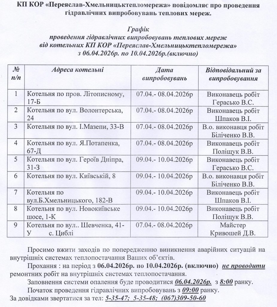 Тепломережа повідомляє про проведення гідравлічних випробувань теплових мереж 31.03.2026 by Адмін in Без категорії · 0 Коментарів