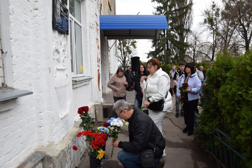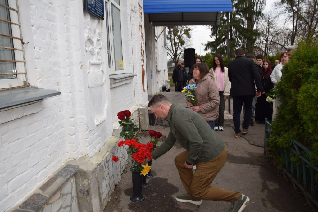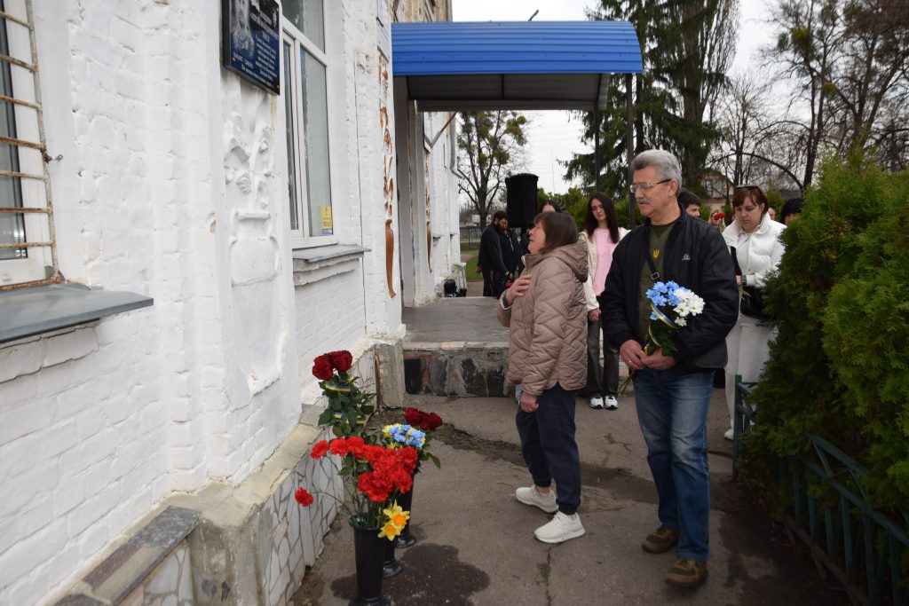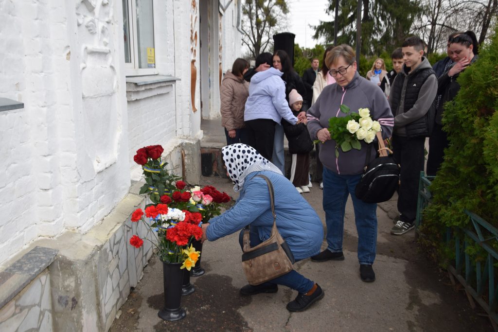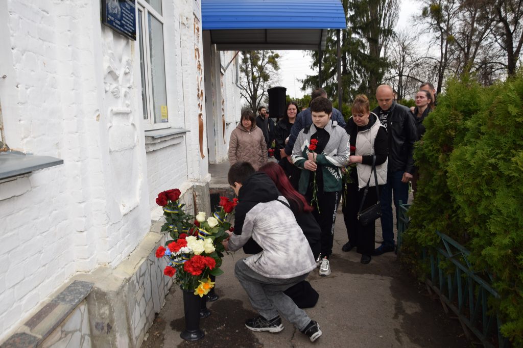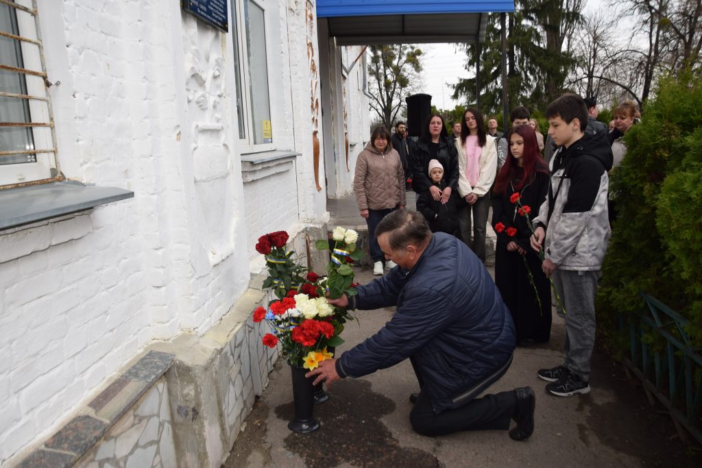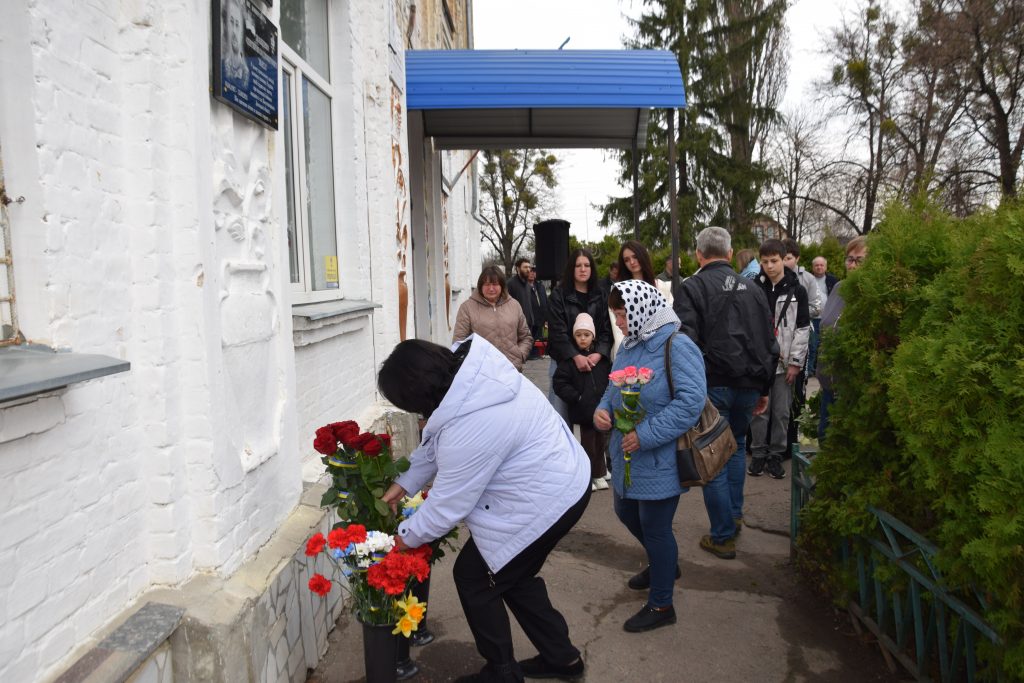 Військовий капелан освятив дошку, і слова молитви тихо розлилися над подвір’ям, мов оберіг. Люди стояли зі схиленими головами, а квіти, що лягали до підніжжя, ставали мовчазними свідками вдячності.