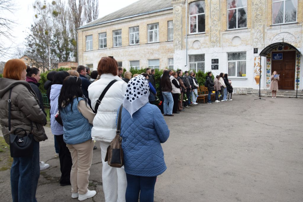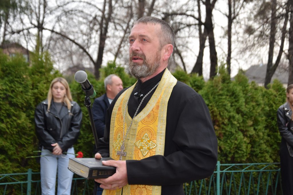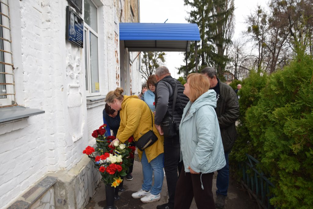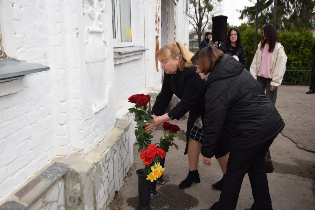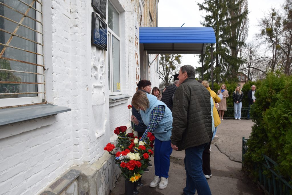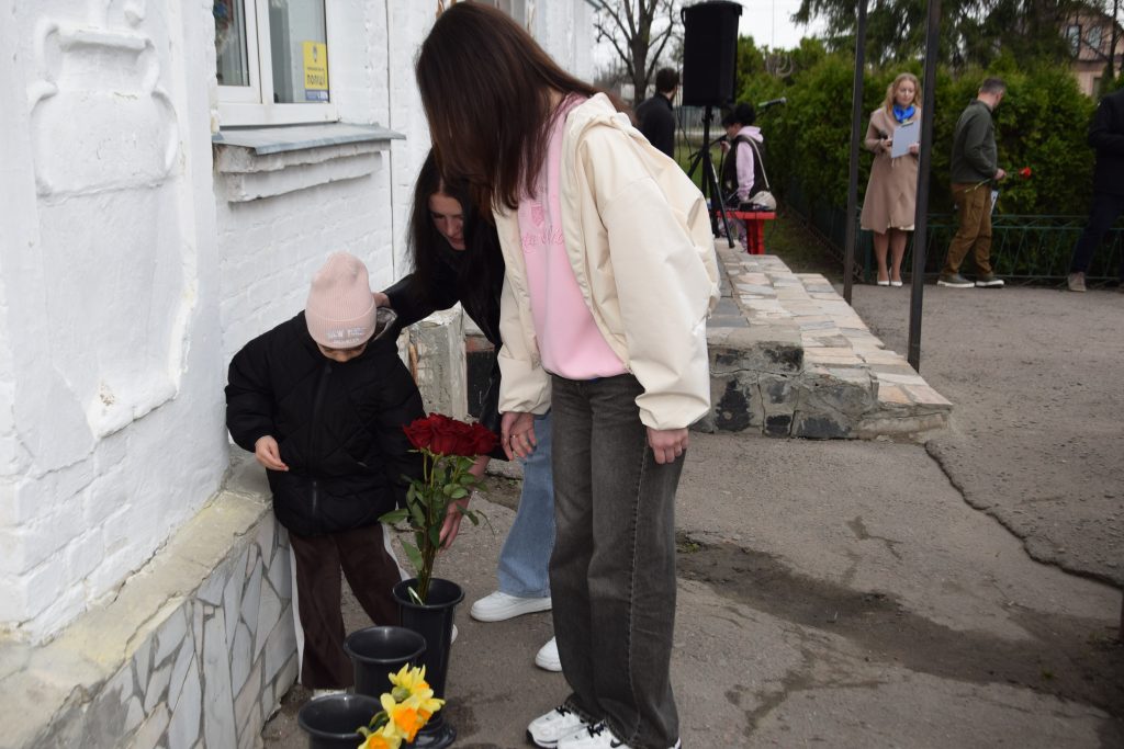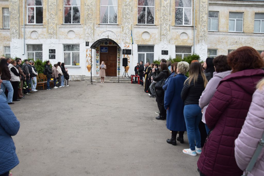 Військовий капелан освятив дошку, і слова молитви тихо розлилися над подвір’ям, мов оберіг. Люди стояли зі схиленими головами, а квіти, що лягали до підніжжя, ставали мовчазними свідками вдячності.