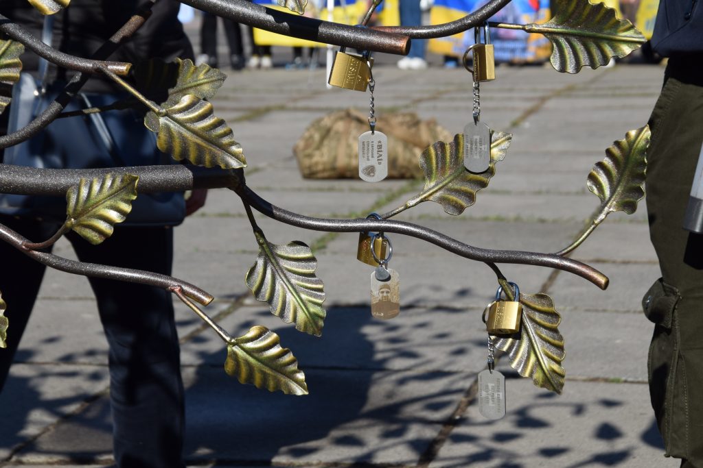 Металевий стовбур, холодний на дотик, але зігрітий руками тих, хто прийшов. Гілки тягнуться вгору — ніби руки, що не втомлюються благати небо: поверніть. На них — імена. Жетони. Прапори з обличчями. Долі, які не зникли — лише загубилися у невідомості.