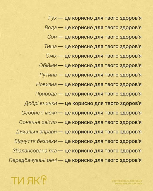 Добре, що є Всесвітній день здоров’я (це сьогодні) і додаткова нагода згадати: ментальне і фізичне здоров’я — це одна система. Тому шукай сонячне світло, пий воду, дихай під рахунок, щоб почуватися добре.
