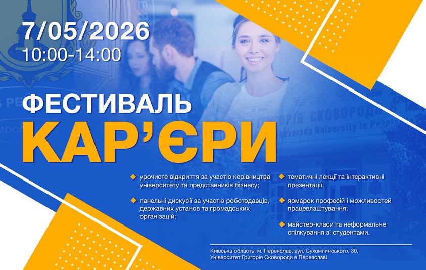7 травня 2026 року з 10:00 в Університеті Григорія Сковороди в Переяславі вперше відбудеться масштабний «Фестиваль кар’єри» – ключова подія для тих, хто прагне побудувати успішну професійну траєкторію, та роботодавців, які шукають енергійні й талановиті кадри.