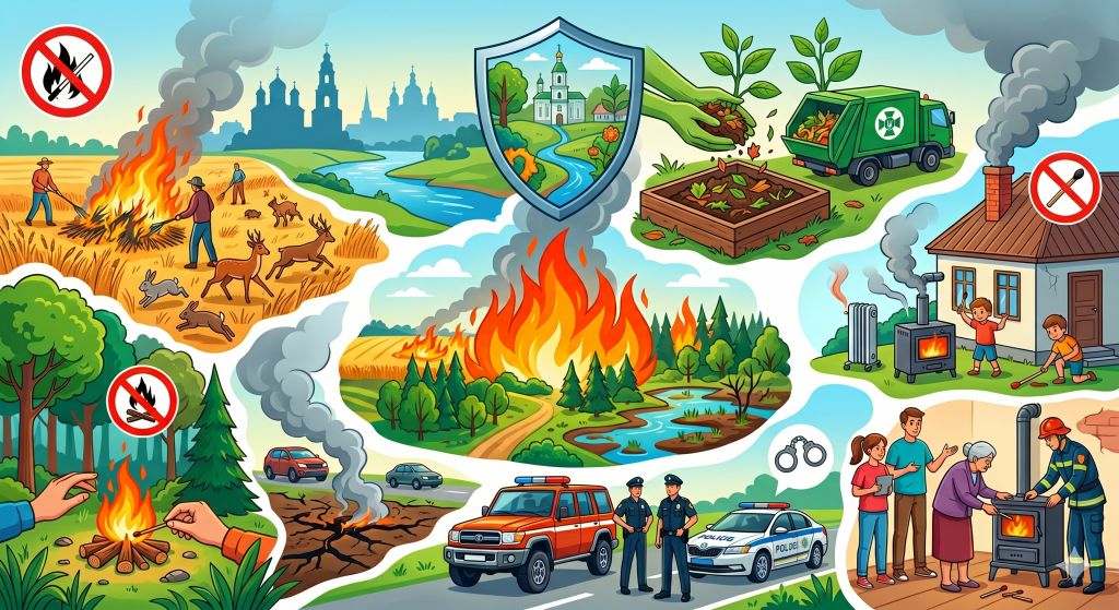 - Випалювання сухої рослинності, стерні, листя та сміття на присадибних ділянках, полях, торфовищах та вздовж доріг.